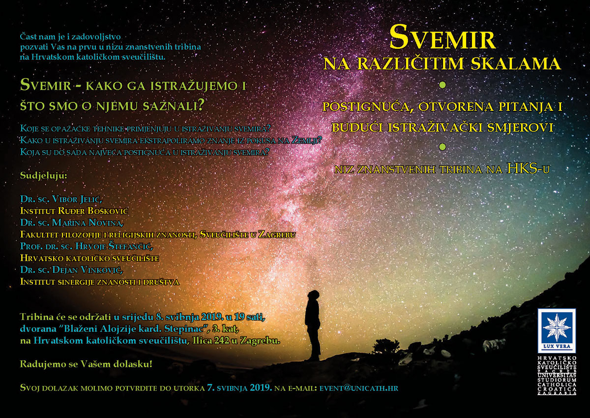 Hrvatsko katoličko sveučilište poziva na znanstvenu tribinu “Svemir na različitim skalama“ u srijedu 8. svibnja 2019 u 19:00 sati koja će se održati na Hrvatskom katoličkom sveučilištu, Ilica 242, Zagreb. U sklopu tribine diskutirati će se o najvećim postignućima u istraživanju svemira, otvorenim pitanjima i budućim istraživačkim smjerovima, a na tribini će sudjelovati neki od prominentnih hrvatskih znanstvenika na tom području.